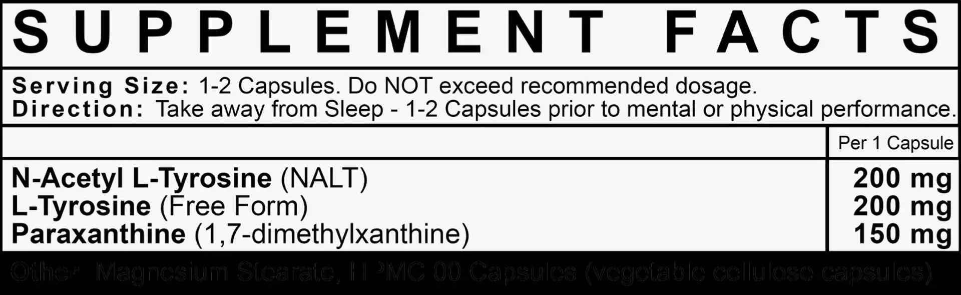 ParaXanthine is synergistically paired with upstream precursor amino acids L-Tyrosine and N-Acetyl L-Tyrosine (NALT), which are integral to dopamine synthesis pathways. This combination enhances dopaminergic activities, improving motivation, mood regulation, and cognitive performance, providing a well-rounded approach to mental energy support.