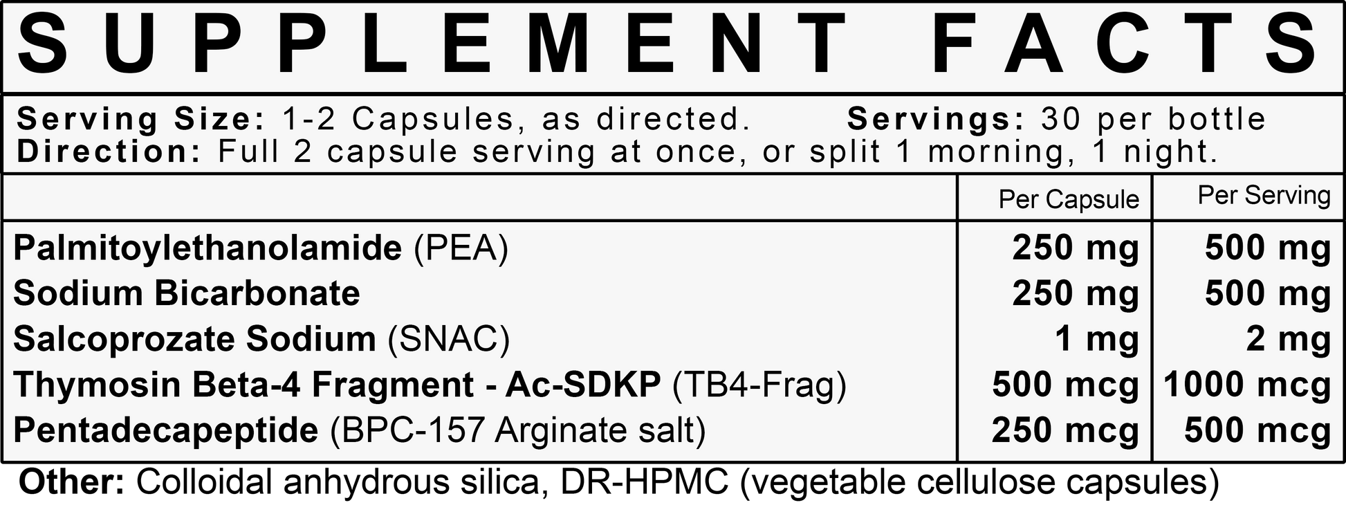 Each capsule contains a synergistic blend of BPC-157 (as Arginine Salt), TB4 Fragment (Ac-SDKP), PEA, SNAC, and Sodium Bicarbonate—without unnecessary fillers or artificial colours.