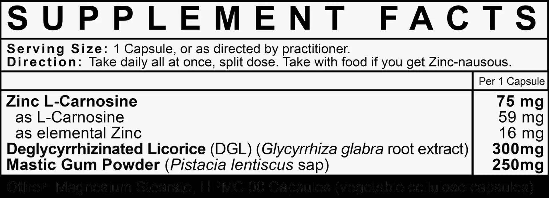 Zinc Carnosine + features ingredients known for their roles in enhancing the integrity of the GI tract. The combination of Zinc L-Carnosine with supportive compounds like Mastic Gum and DGL works to maintain a healthy gut lining, reduce inflammation, and support digestive system comfort.